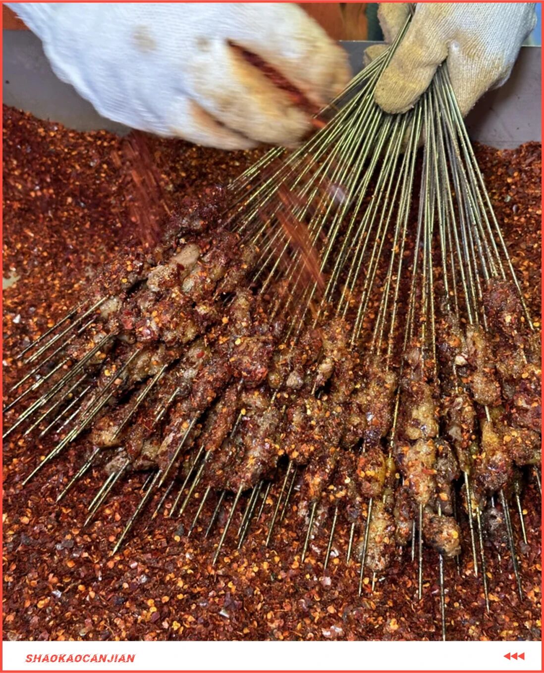 甘肅的辣椒面也值得一提,當?shù)責镜昊径际鞘止つ胫贫,手工不比機器精細,這般做出的辣椒,保留了粗糲口感的小塊辣皮和辣籽,與烤肉相遇后,使之口感更為豐富,當然,各家手法不同,味道也各有千秋。