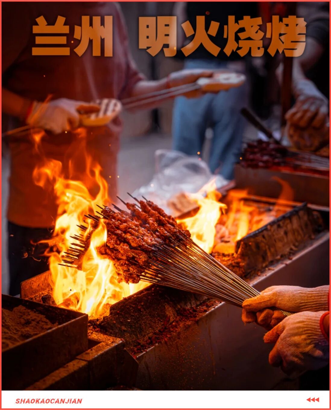 甘肅人燒烤喜用明火,火焰升騰中,肉串穿梭其間,旁人看得心驚,唯恐燒得焦黑,難以入口,但經(jīng)驗高明的燒烤師傅自然毫不為意,閑聊的工夫,就已安頓妥當這道美食。